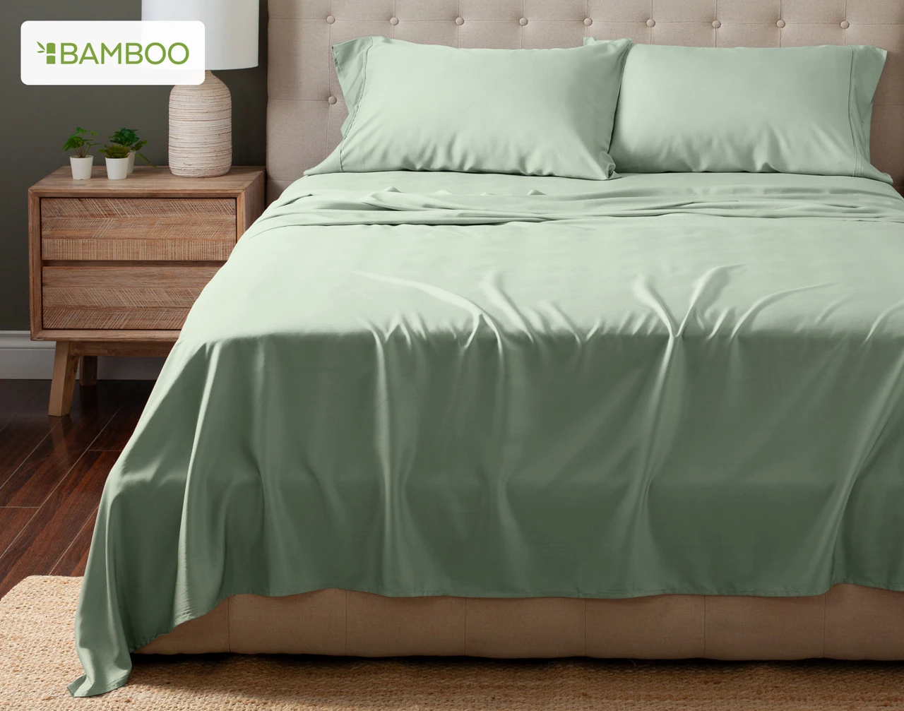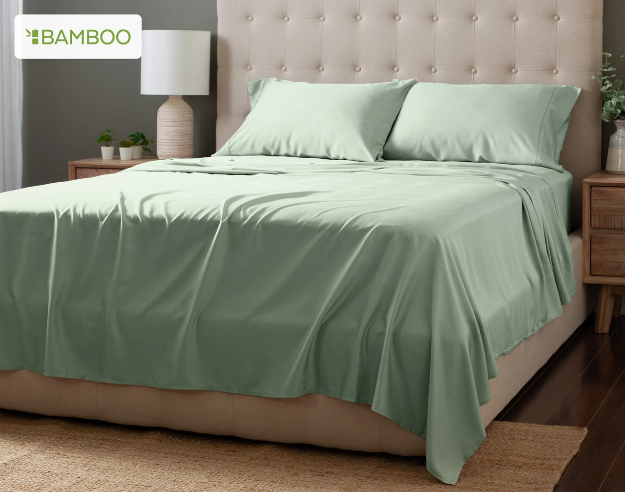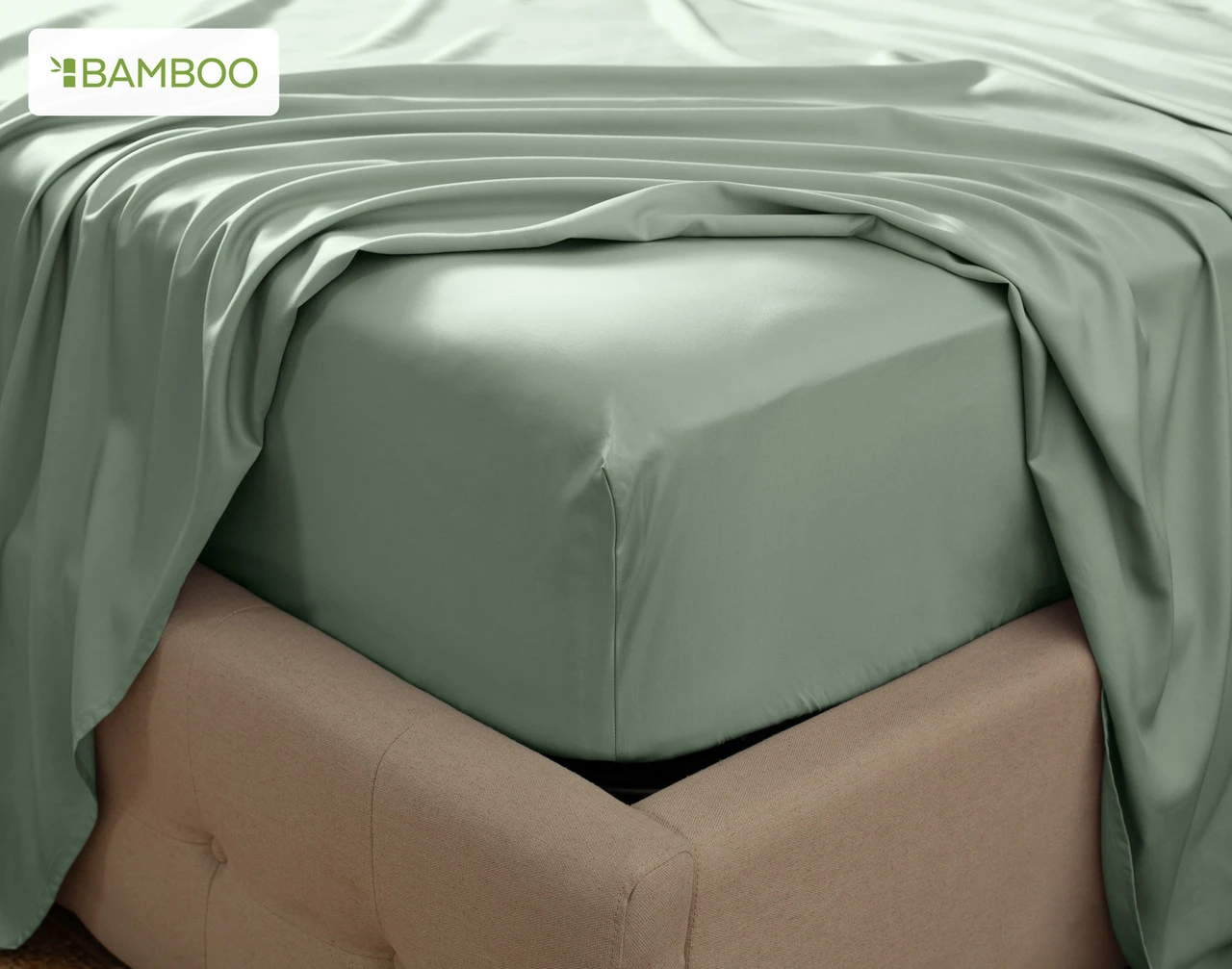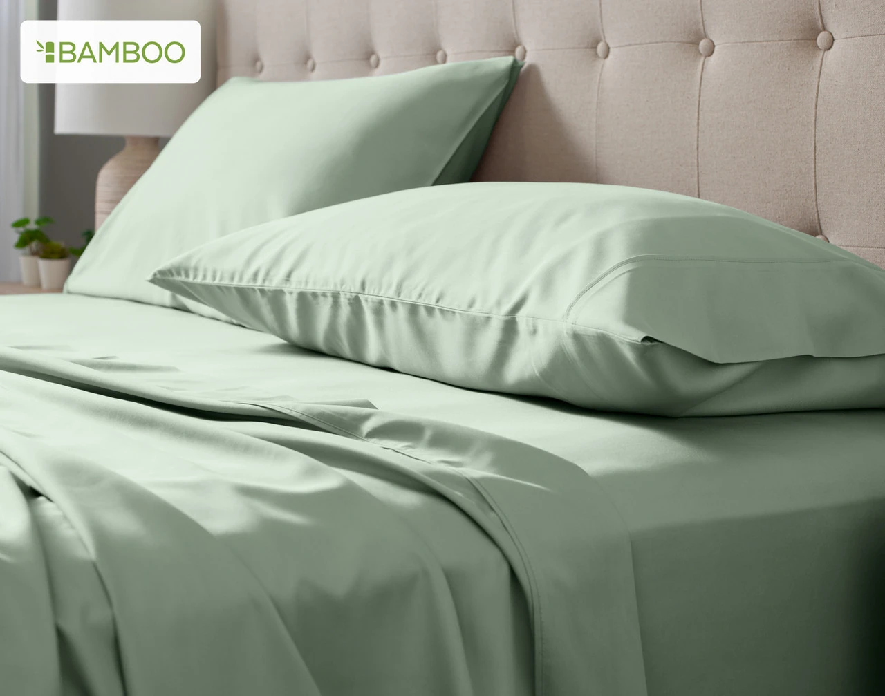 Drift into cool comfort with our Misty Fern Bamboo Moon Sheet Set. Crafted from 100% rayon from bamboo with a durable twill weave, these solid colour sheets offer a remarkably smooth touch that naturally softens when washed. Gentle on skin and kind to the planet, bamboo fibers wick away moisture, resist odours, and drape elegantly over your bed. Each set includes a flat sheet, fitted sheet, and matching pillowcase(s) for a complete sleep experience.