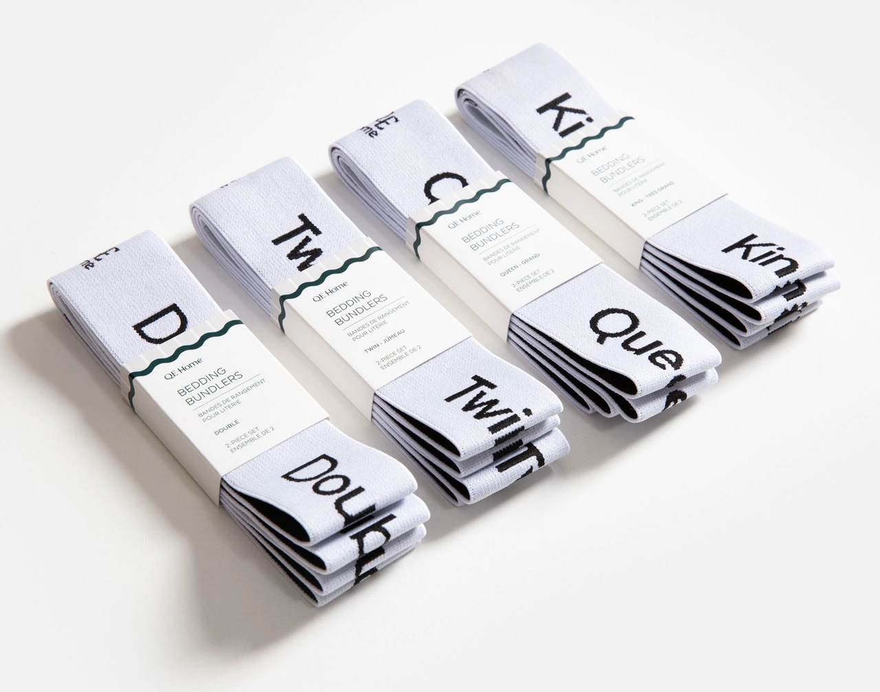 Each bundle includes one felt basket, one bedside felt pocket, one duvet storage bag, and two bedding bundlers. Each bundler is equally sized, but features its respective size written across its surface.