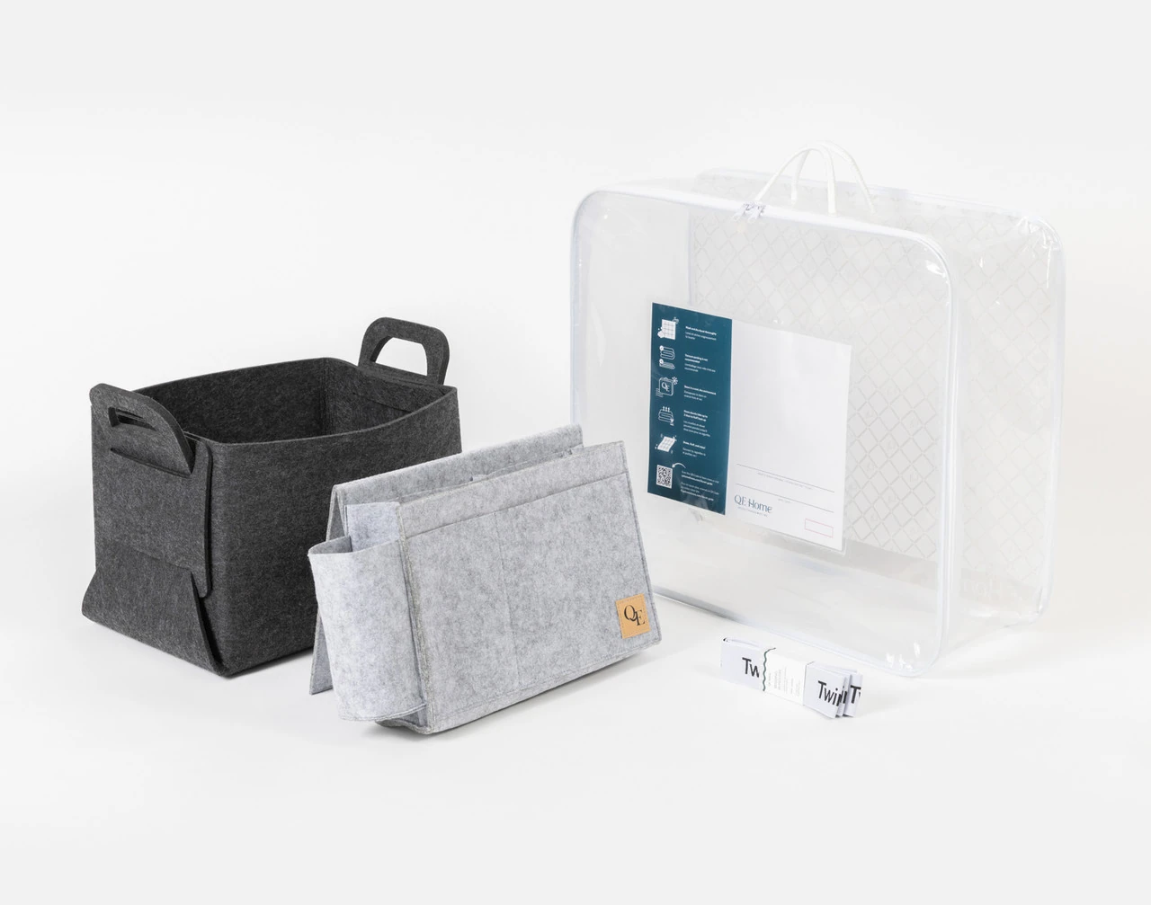 Each bundle includes one felt basket, one bedside felt pocket, one duvet storage bag, and two bedding bundlers. Each bundler is equally sized, but features its respective size written across its surface.