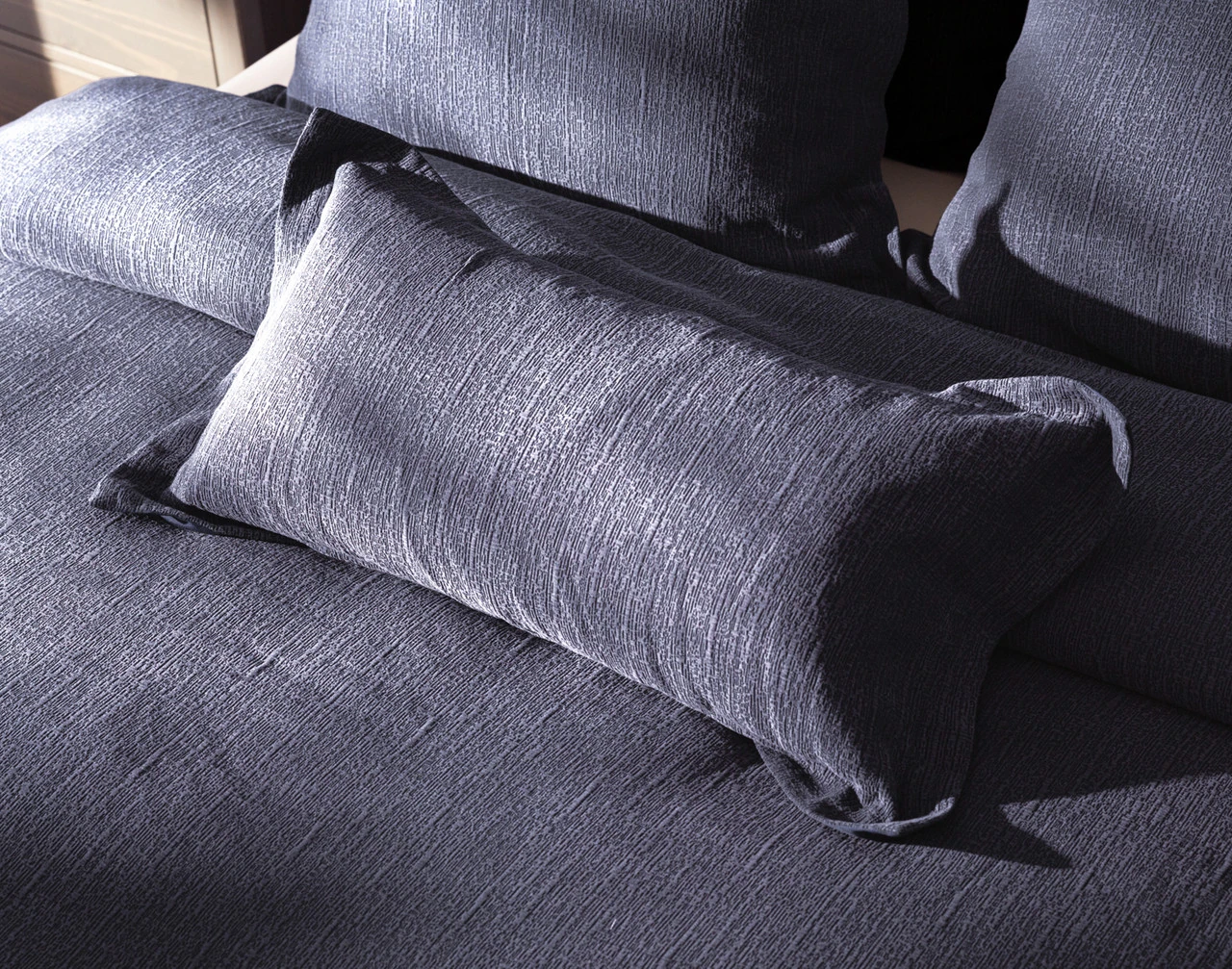- Tactile jacquard surface in a solid blue shade