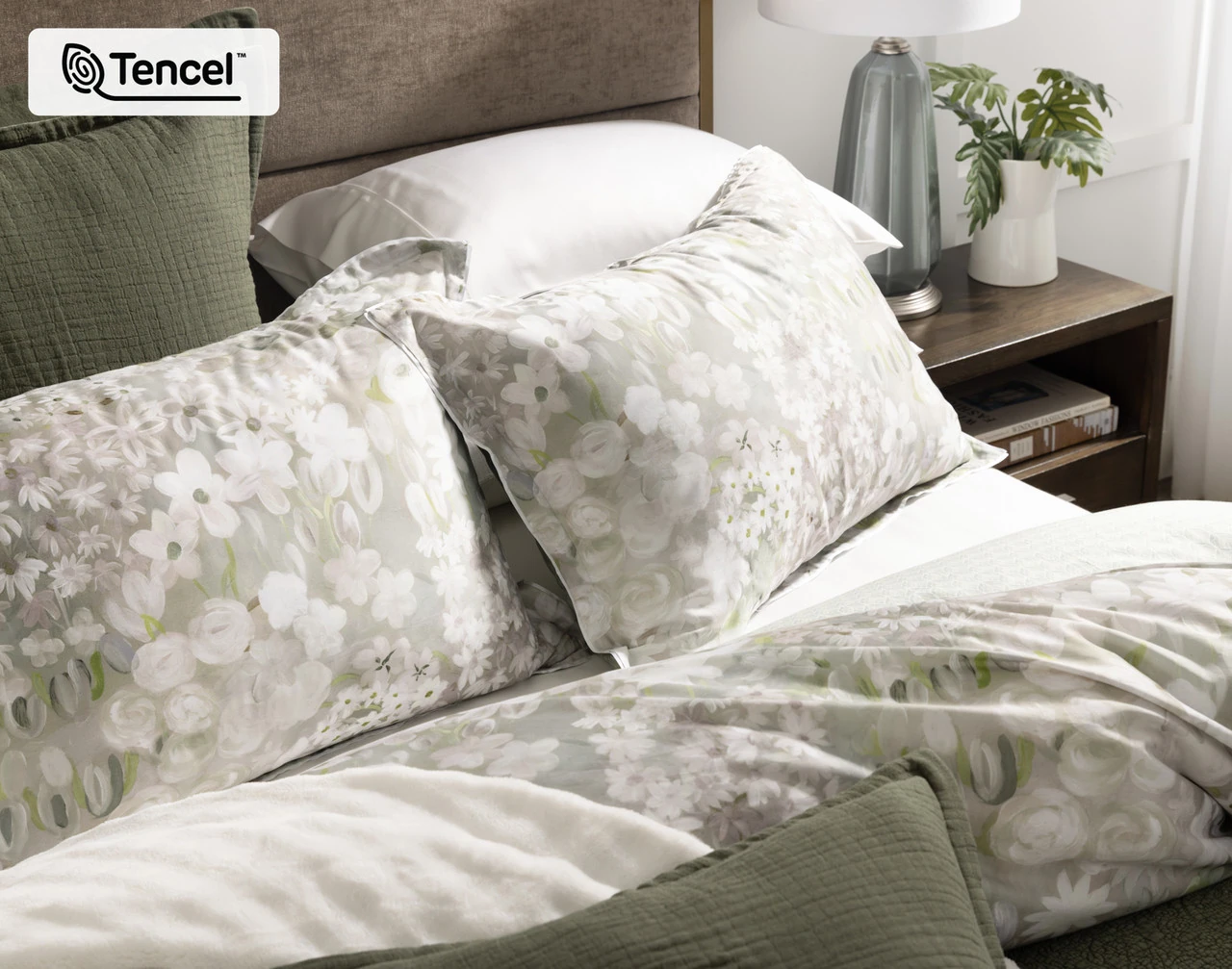 Sleep in a soft floral freshness with our Elora Duvet Cover. Inspired by the gentle stillness of a morning garden, Elora features a medley of hand painted florals in soft whites and muted sage greens. The dreamy watercolour textures create a calming, fresh design that feels both timeless and inviting. Elora is printed on super soft TENCEL™ Lyocell cotton blend fabric and reverses to reveal a geometric art deco-inspired print in green.