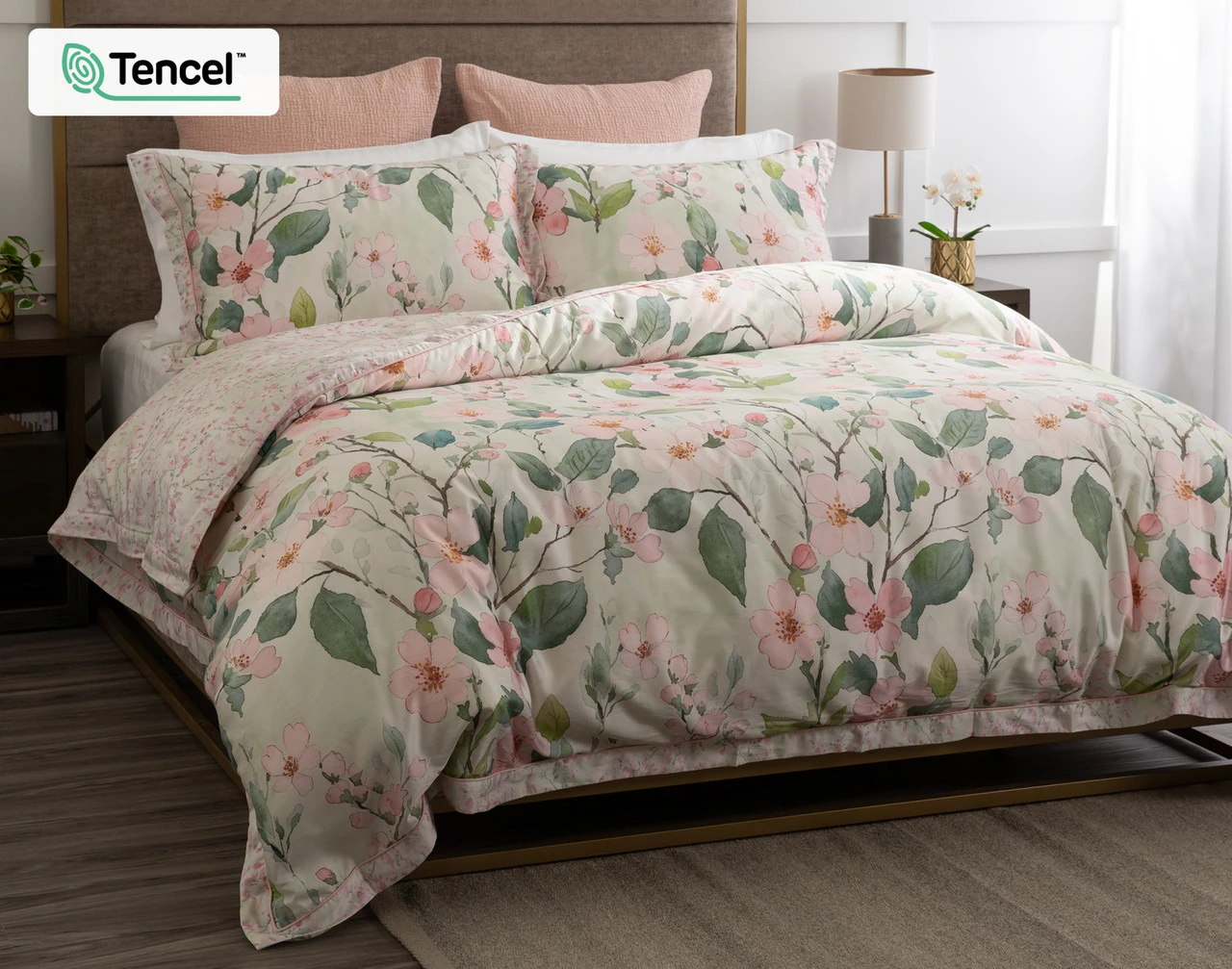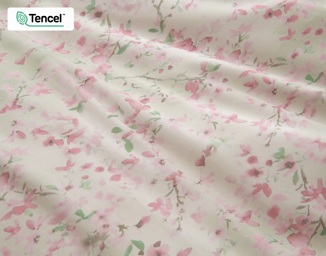 Sleep in pink floral bliss with our Enamour Duvet Cover. An expressive watercolour design, Enamour features soft pink flowers and green leaves growing delicately on branches winding up the bed. Crafted from a soft and buttery blend of TENCEL™ Lyocell and cotton, our duvet cover is breathable and temperature-regulating for serenely fresh sleep. Enamour reverses to a coordinating pink floral design with small, dainty flowers on a soft green background.
