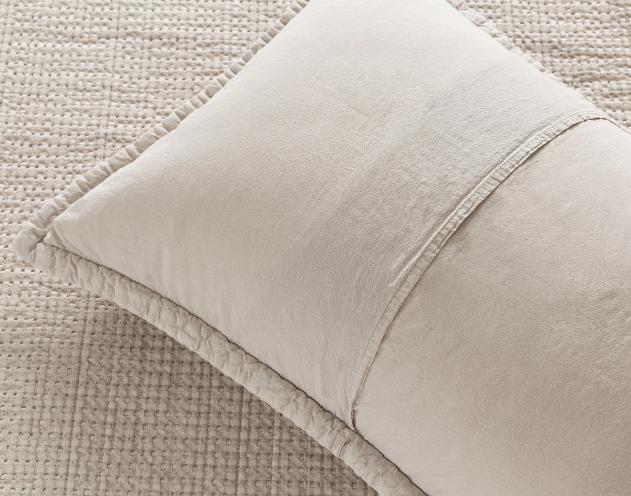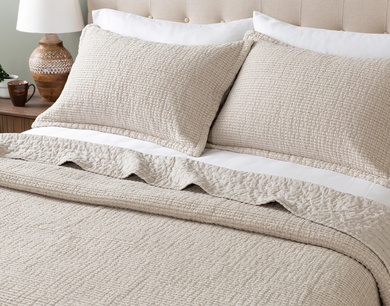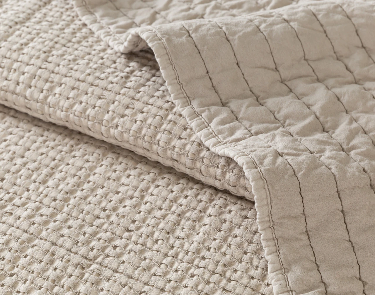 Step into luxurious comfort and timeless style with our Foothills Cotton Quilt Set. Featuring a delightfully tactile waffle knit surface in a solid ash beige shade, this cozy quilt set reverses to a stitched stripe pattern on its backing, and comes with coordinating pillow sham(s) to complete the look. Fabricated with a 100% cotton shell and pre-washed for extra softness, this quilt set is light and breathable — perfect for use on its own in warm weather, or as an extra layer during colder seasons.