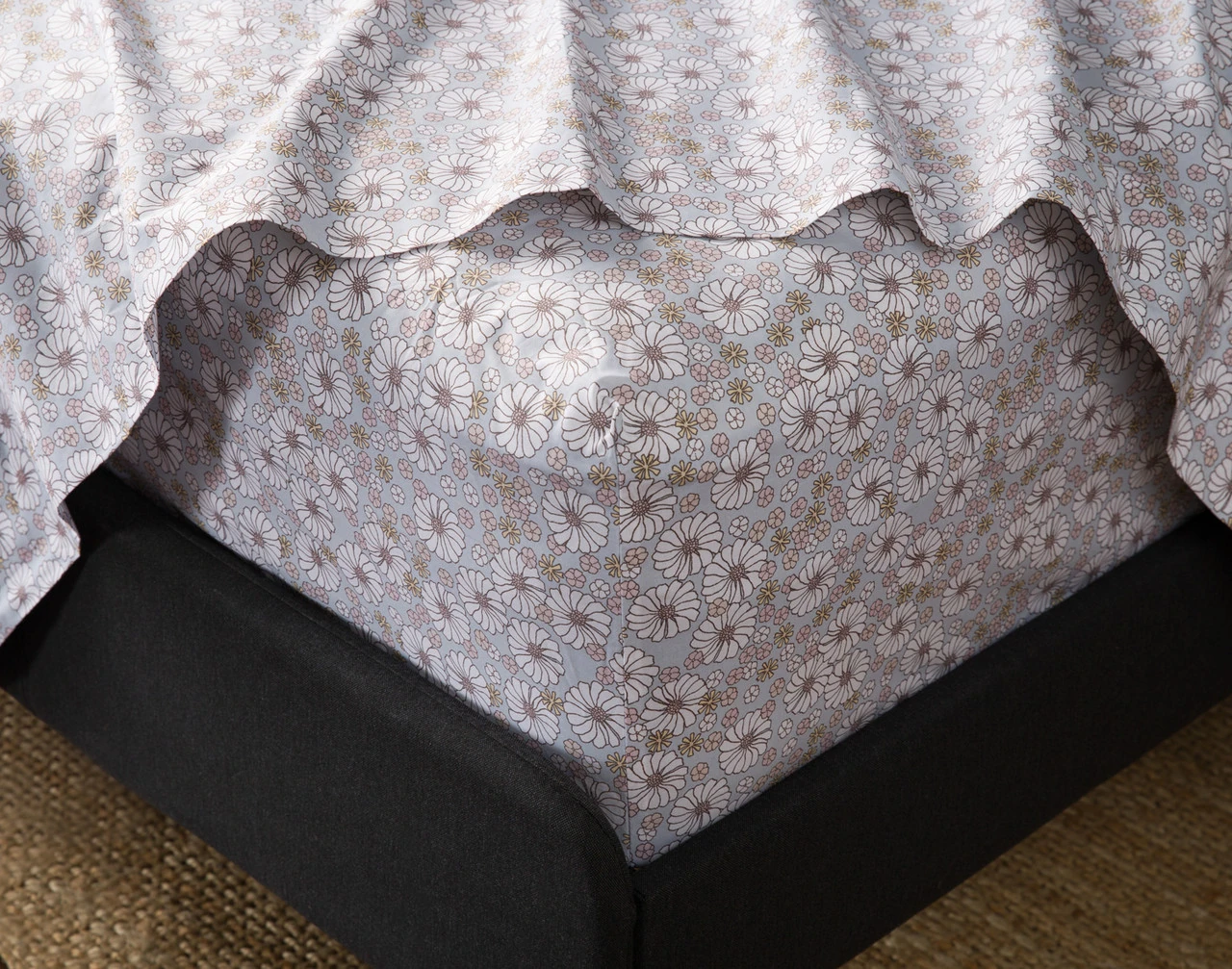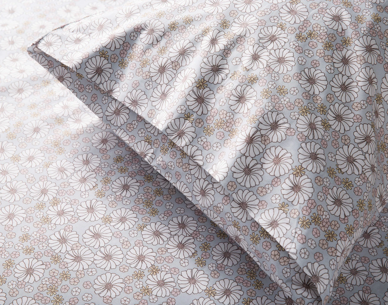 Turn any bed into a dreamy escape with our Flora Cotton Percale Sheet Set. Featuring a 200 thread count percale weave, this twin-sized cotton sheet set features a delightful printed pattern of scattered daisies, and comes complete with a matching fitted sheet, flat sheet, and pillowcase for a full look. Easy care and perfectly soft, this cozy collection offers classic comfort and spirited style for little dreamers.