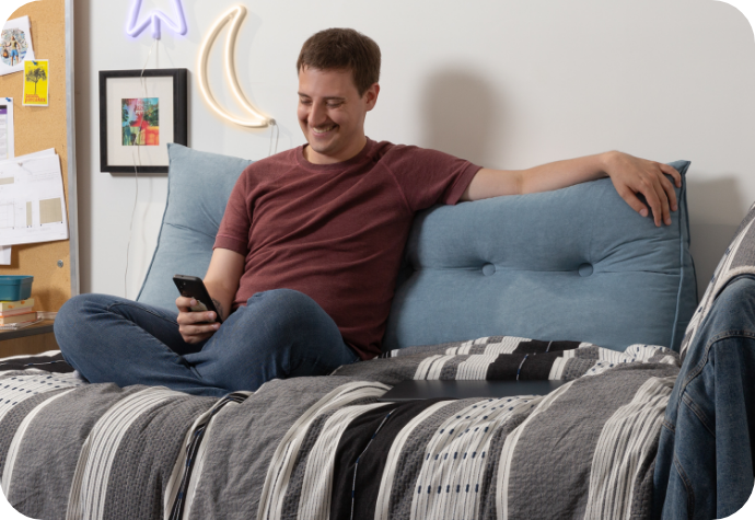 Catching up on readings from bed? Use purpose-made pillows or euros to support your back and add extra oomph to your dorm bed setup. Our Wedge Pillows (pictured below) transform your bed into a quasi-sofa, making it an ideal solution for creating a cozy, home-like atmosphere in small spaces.