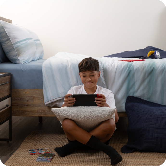 Temperature-regulating, moisture-wicking sheets are also a must for sleepy teens. We recommend Bamboo Charcoal or TENCEL™ Lyocell sheets for super fresh, extra comfy sleep. Add in an extra breezy layer and shield their bed from late-night snack spills with pillow and mattress protectors.