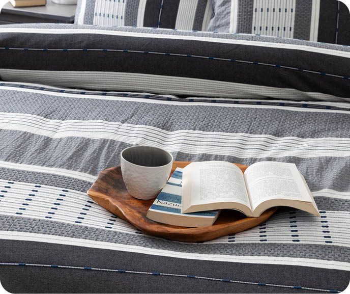 If you’re looking for something ultra chic and contemporary this season, Genevieve’s got you covered with the Dash Duvet Cover. This effortlessly stylish design, made with cozy yarn-dyed cotton jacquard fabric, features relaxed, textured horizontal lines in alternating soft whites and light greys, accented with raised deep blue stitches.