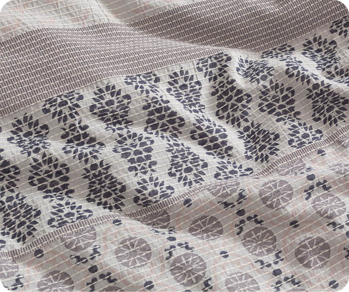 This timeless yet contemporary retreat features shifting rows of botanical and patterned designs in grey, navy, and muted blush tones, and recreates this traditional stitching technique using soft, yarn-dyed cotton jacquard.