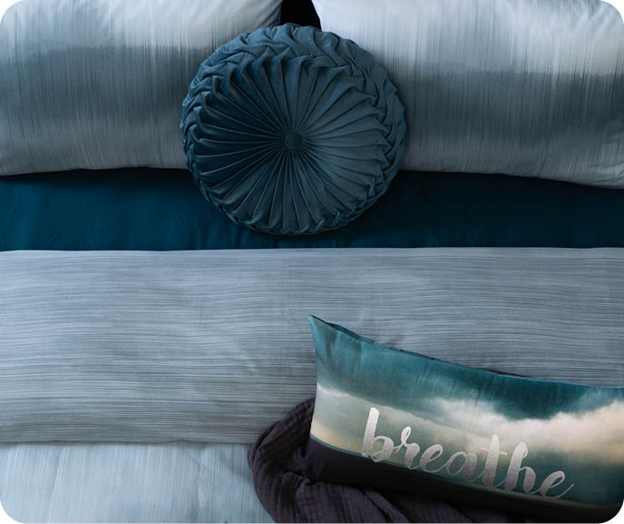 Heike’s Styling Tip: Use your sheeting choices to set the mood by playing off the different cool tones featured in the Dash Collection. For example, you can keep things neutral with our silvery Bamboo Cotton Sheet Set with Activated Charcoal, or accent the deeper hues with our Eucalyptus Luxe Fitted Sheet in Navy.