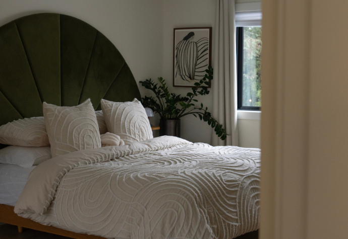 I aim for a welcoming and playful vibe throughout my home, blending comfort with style. Specifically, my design choices draw inspiration from midcentury modern and 1970s styles, with a hint of Memphis. I adore warm woods, clean lines, and splashes of colour—I’m definitely not a minimalist. So, when it comes to bedding, bold palettes, prints, and patterns feel right at home in my space, but I do try to select items that complement our striking green headboard. For me, a lush, inviting bed is ~everything~ so, naturally, I’m in the “more is more” camp when it comes to pillows and layers.