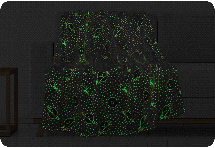 Fun layers like our ‘Happy Planet’ Glow In The Dark Fleece Throw can add comfort to a dark bedroom.