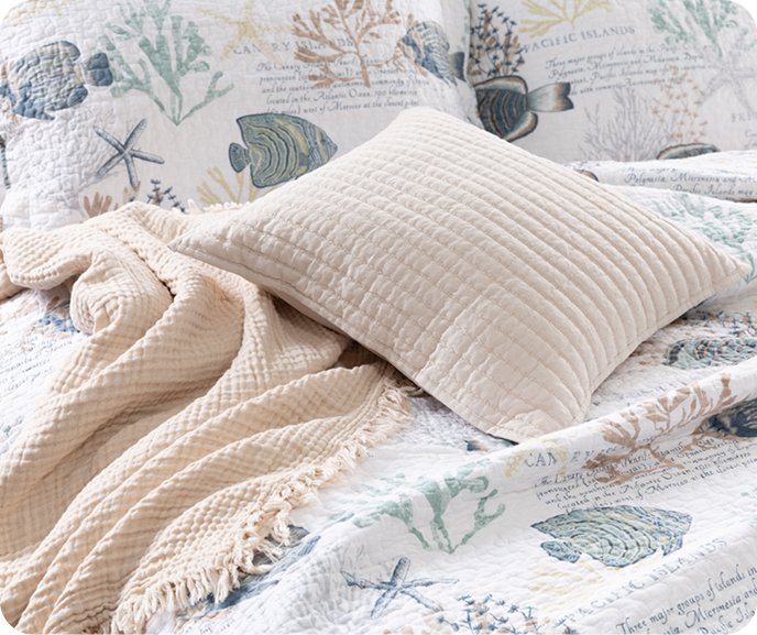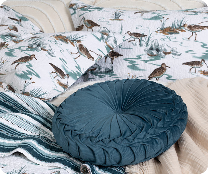 Dress your guest room to impress — and to make it feel warm and inviting. A great place to start is with art — both on the walls and on the bed. Give the guest bed a fresh look with luxury designer linens and cottage-inspired quilt sets, perfect for stylish summer stays. And of course, don’t skip the foundation: soft, cozy sheets are a must!