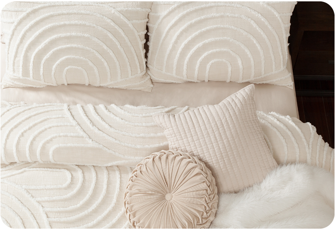 Choose an ornately textured fabric (or a pleasantly simple textural design) for your top-most layer, and pair it with fellow simple textures to create a slumber spot that's both warm and welcoming. Then, you can add depth and flourish by layering cushions and throws!