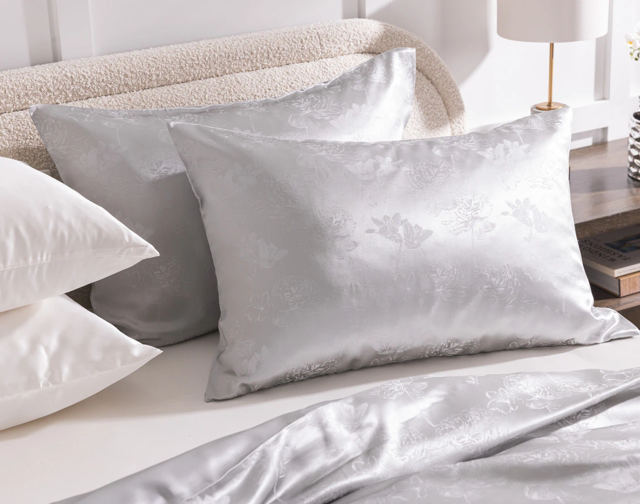 Treat yourself to a heavenly sleep with our Reflections Silk Blend Duvet Cover Set. Crafted with a blend of silk and lyocell fibers, this elegant silver bedding set possesses exceptional temperature regulating properties, keeping warm sleepers cool and cool sleepers warm year-round. These fibers are also hypoallergenic and gentle on your hair and skin, making for a truly restful and soothing sleep. Complete with two matching pillowcases and a stylish etched floral design, this silk duvet cover set is a dream for sleepers who love that luxury feel.