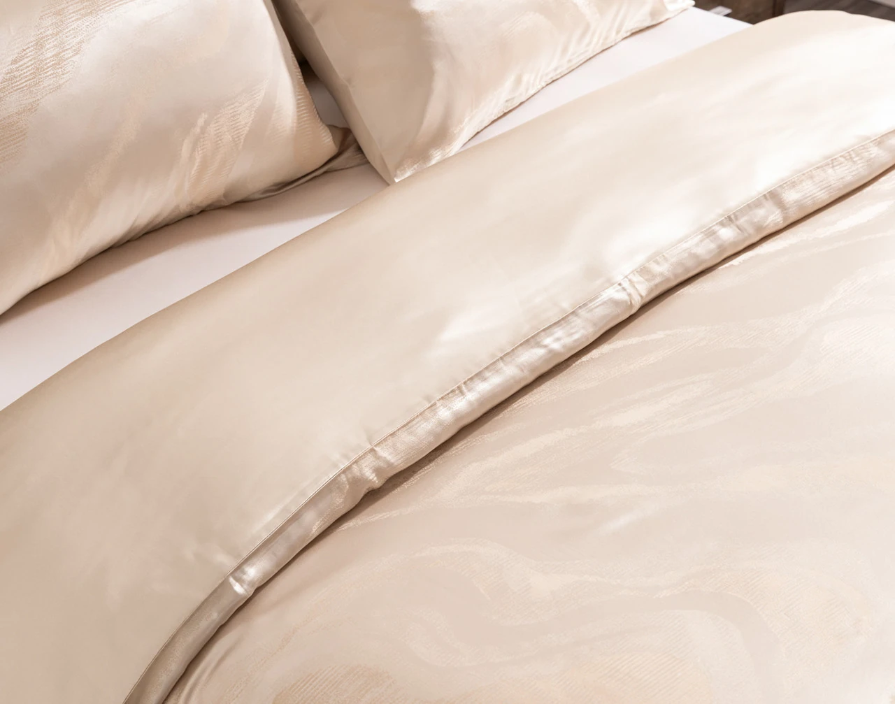 Treat yourself to a heavenly sleep with our Solace Silk Blend Duvet Cover Set. Crafted with a blend of silk and lyocell fibers, this shimmering gold bedding set possesses exceptional temperature regulating properties, keeping warm sleepers cool and cool sleepers warm year-round. These fibers are also hypoallergenic and gentle on your hair and skin, making for a truly restful and soothing sleep. Complete with two matching pillowcases and a chic etched wave design, this silk duvet cover set is a dream for sleepers who love that luxury feel.